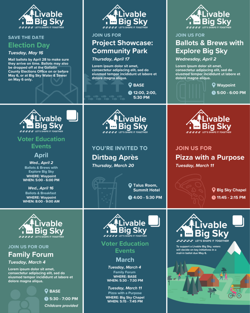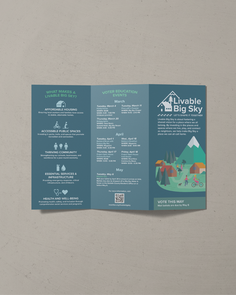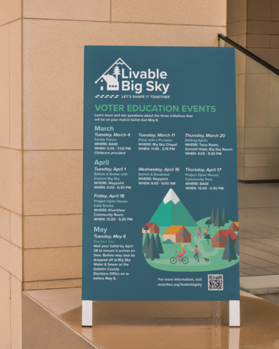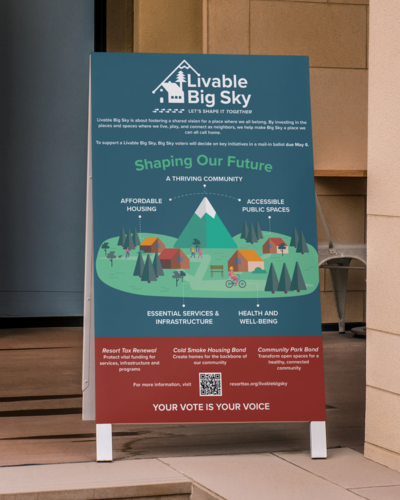 Starting in fall 2024, we began designing print ads for the local newspaper, Explore Big Sky. In 2025, we worked with BSRAD to build a brand for their voter education campaign, Livable Big Sky. Livable Big Sky was created to showcase the importance of investing in Big Sky and its community so residents can live, play, and connect as neighbors. In May 2025, residents will vote on three initiatives: Resort Tax Renewal, the Cold Smoke Housing Bond, and the Community Park Bond.