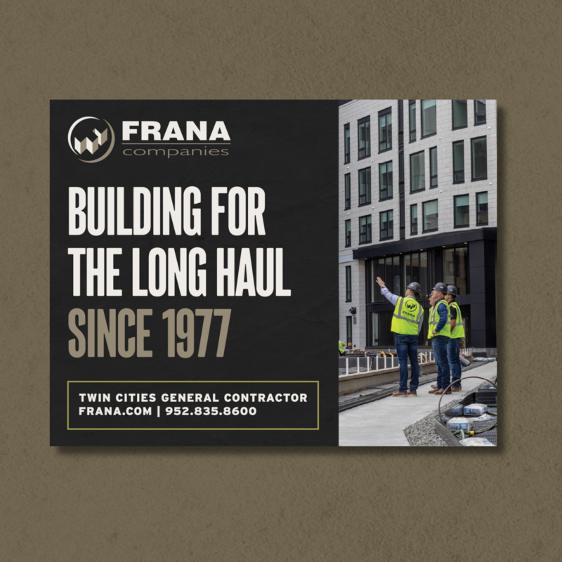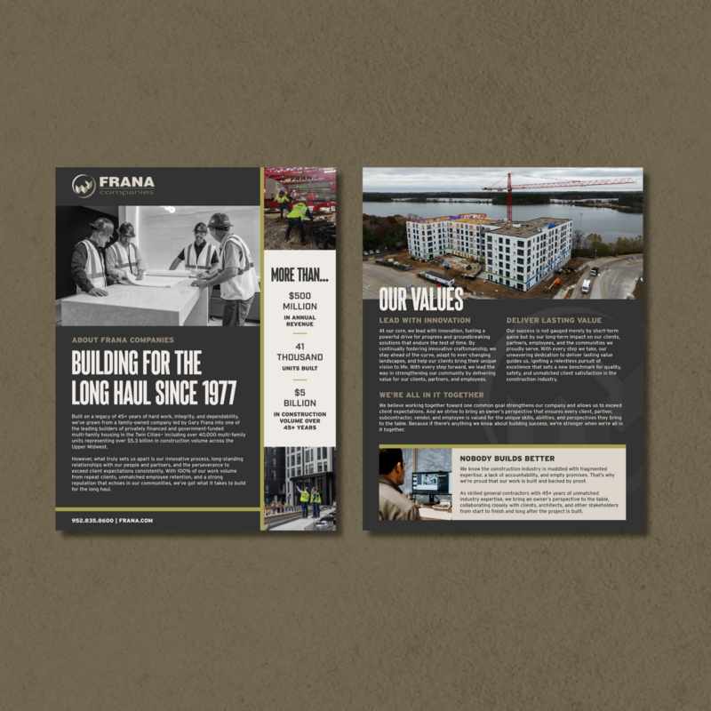 Frana Companies was founded in 1977 and is the 10th largest general contractor in the Twin Cities specializing in multi-family, affordable, and senior housing. They are unique in that they built one of the first wall manufacturing plants in the Midwest, which they expanded on with a new floor plant in 2023. We’ve been working with them since 2018 to design print ads, banners, t-shirts, and more. We also manage all of their social media content and frequently help them with public relations. Lastly, we began designing their project proposals (for multi-million dollar projects) to help them really stand out; they have won every project proposal that we have designed.
